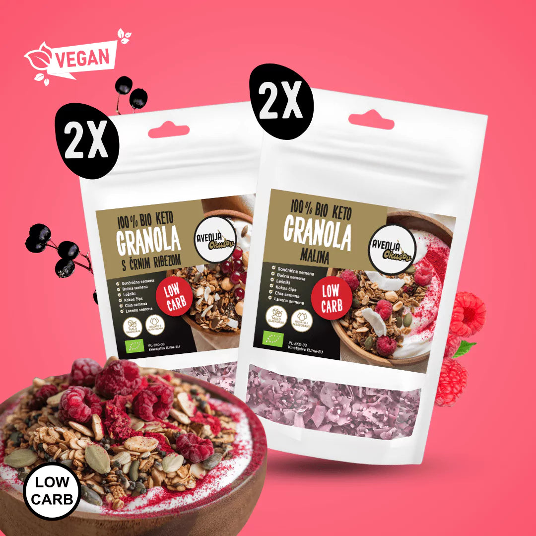 Odkrijte slastno kombinacijo BIO KETO granol z okusoma maline in črnega ribeza! 🍓🫐