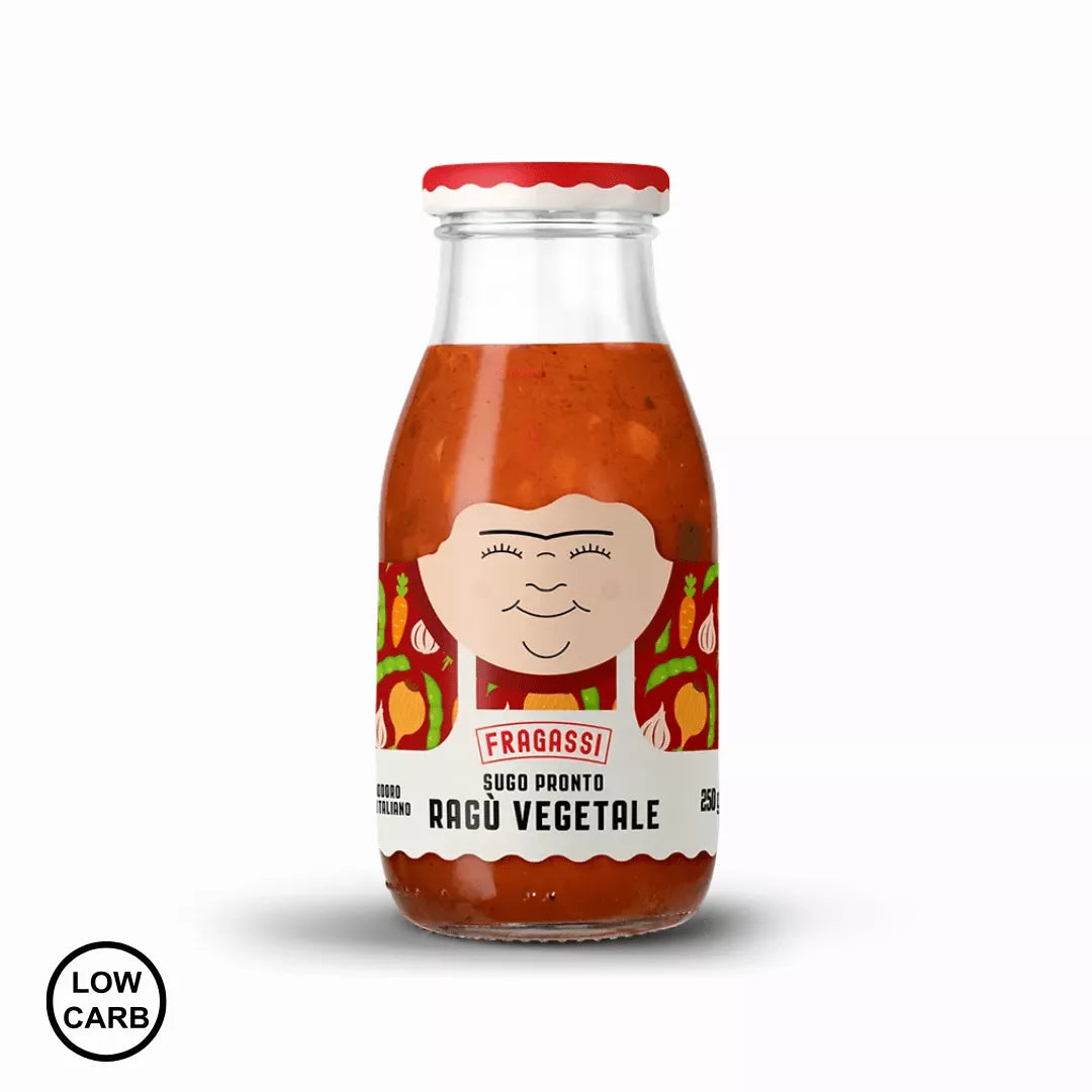 Ta zelenjavni ragu s sojo združuje sočne italijanske paradižnike, nežno sojo, korenje, čebulo in zeleno, obogatene z ekstra deviškim oljčnim oljem in aromatičnimi začimbami.
