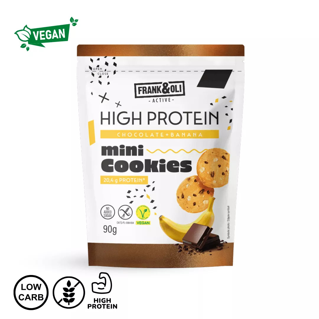 Proteinski mini piškoti banana & čokolada Frank&Oli so hrustljavi, okusni in polni beljakovin ter vlaknin.